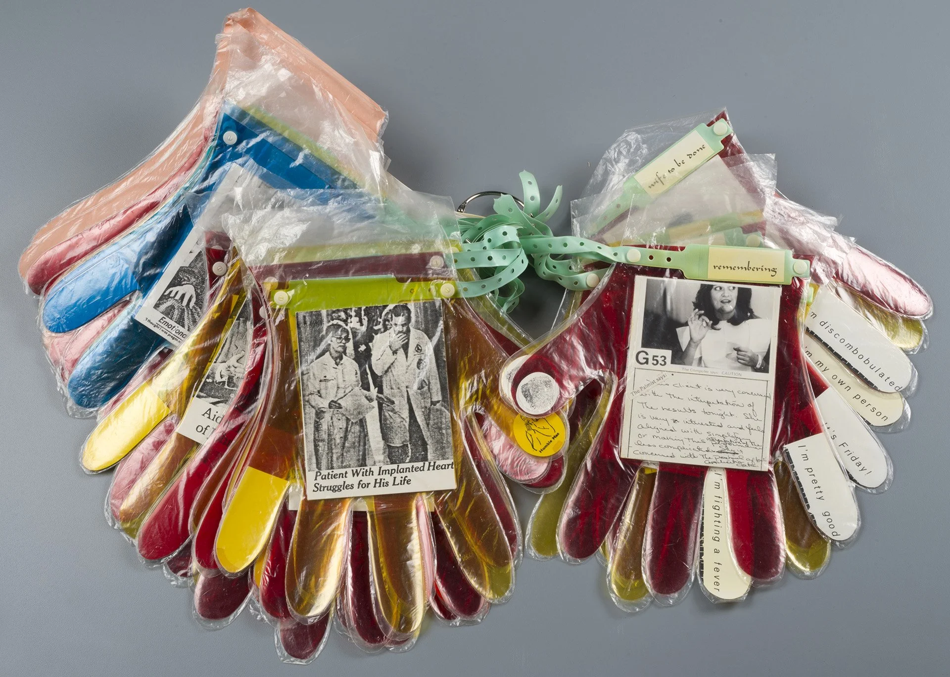 A Hand Book, 1986. Plastic gloves, hospital wristbands, cellophane, photocopy on paper, key ring. 24 pages, ~14W x 12H x 2.5D inches.