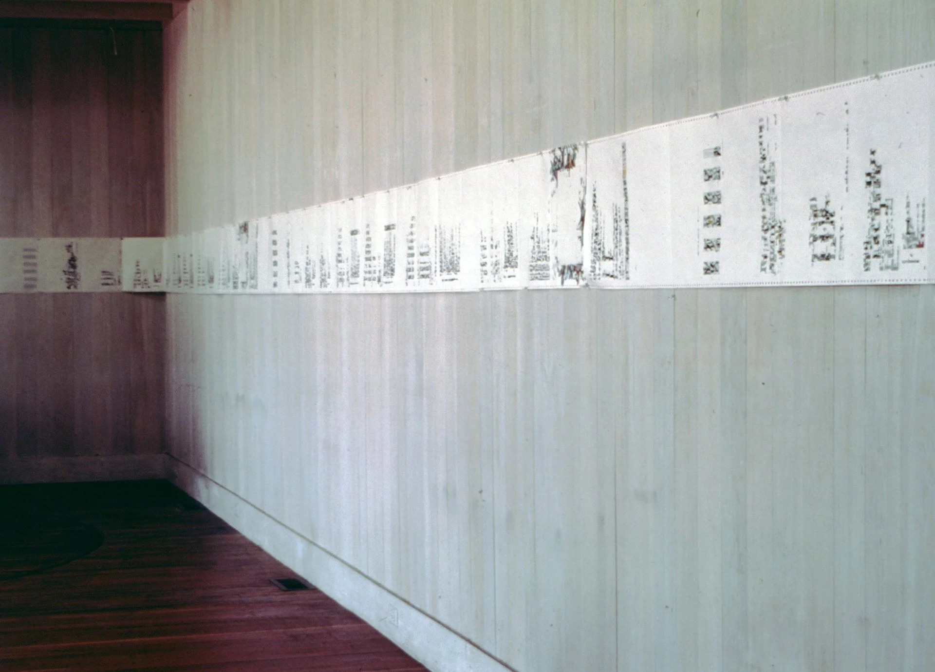 Hovenweep V - VII, 1977. Prismacolor, graphite, colored type, and dot-matrix print on computer printout paper, 14.875W x 132H inches. Installed at Julie Casemore Gallery, San Francisco, 2022.